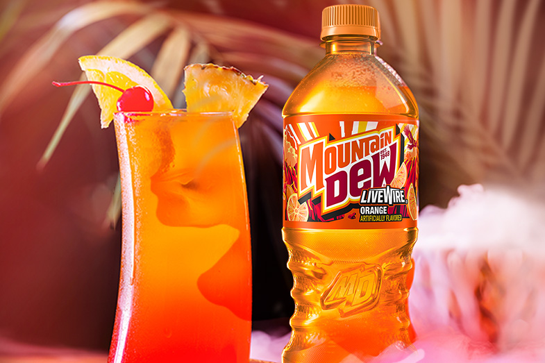 Beach vibes come alive in sunset hues with the tropical flavors of pineapple and orange juices, coconut rum, grenadine, and bold orangy Mountain Dew Livewire.